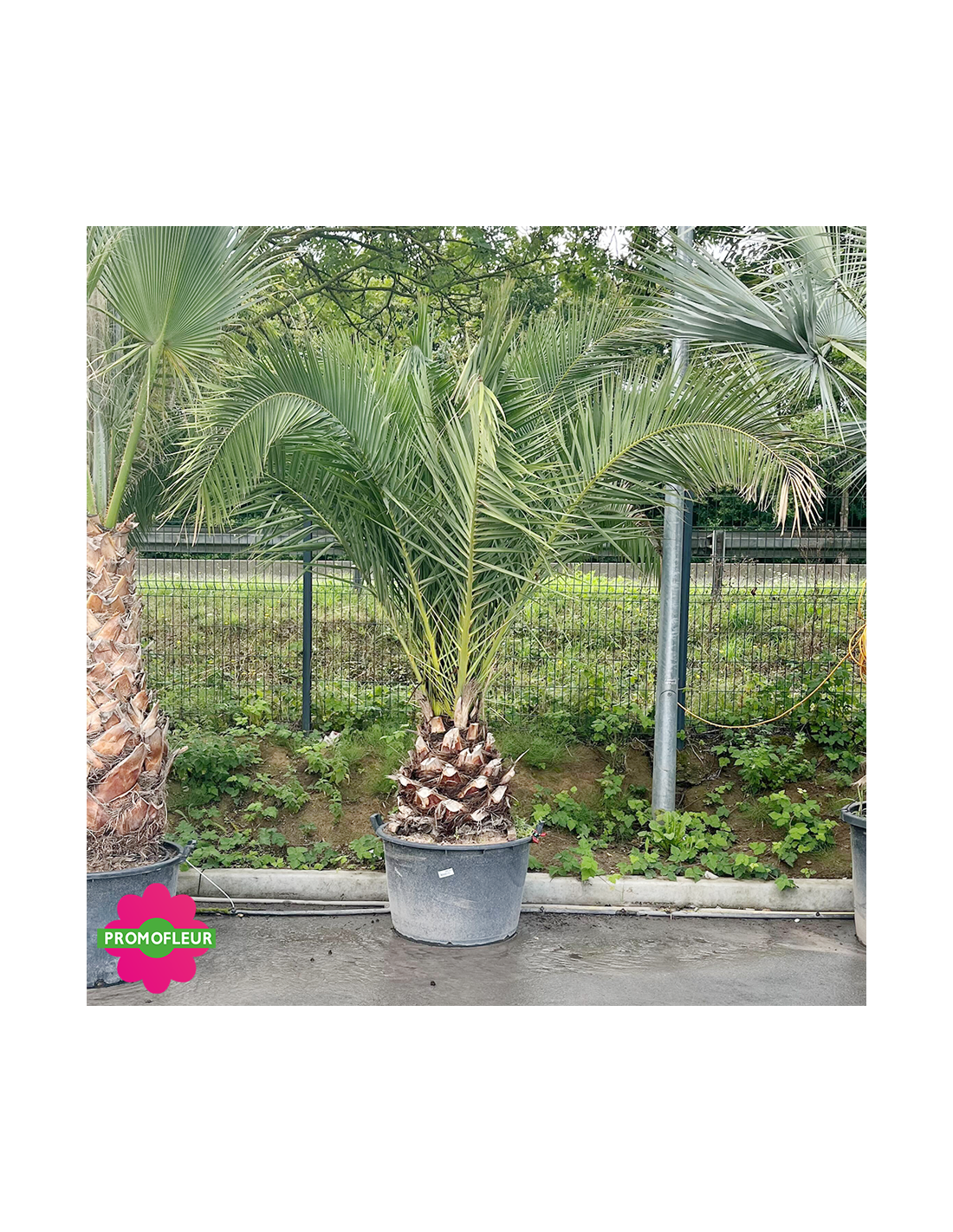 Ce palmier Phoenix Canarien a pour stipe ou hauteur de tronc 60 cm. Ce palmier Phoenix canariensis est connu pour son stipe épais, ses longues et magnifiques palmes en forme de peigne. L'ensemble de son feuillage persistant atteint 3 à 4 m d'envergure actuellement. Sa taille adulte peut atteindre entre 5 et 15 m de hauteur.