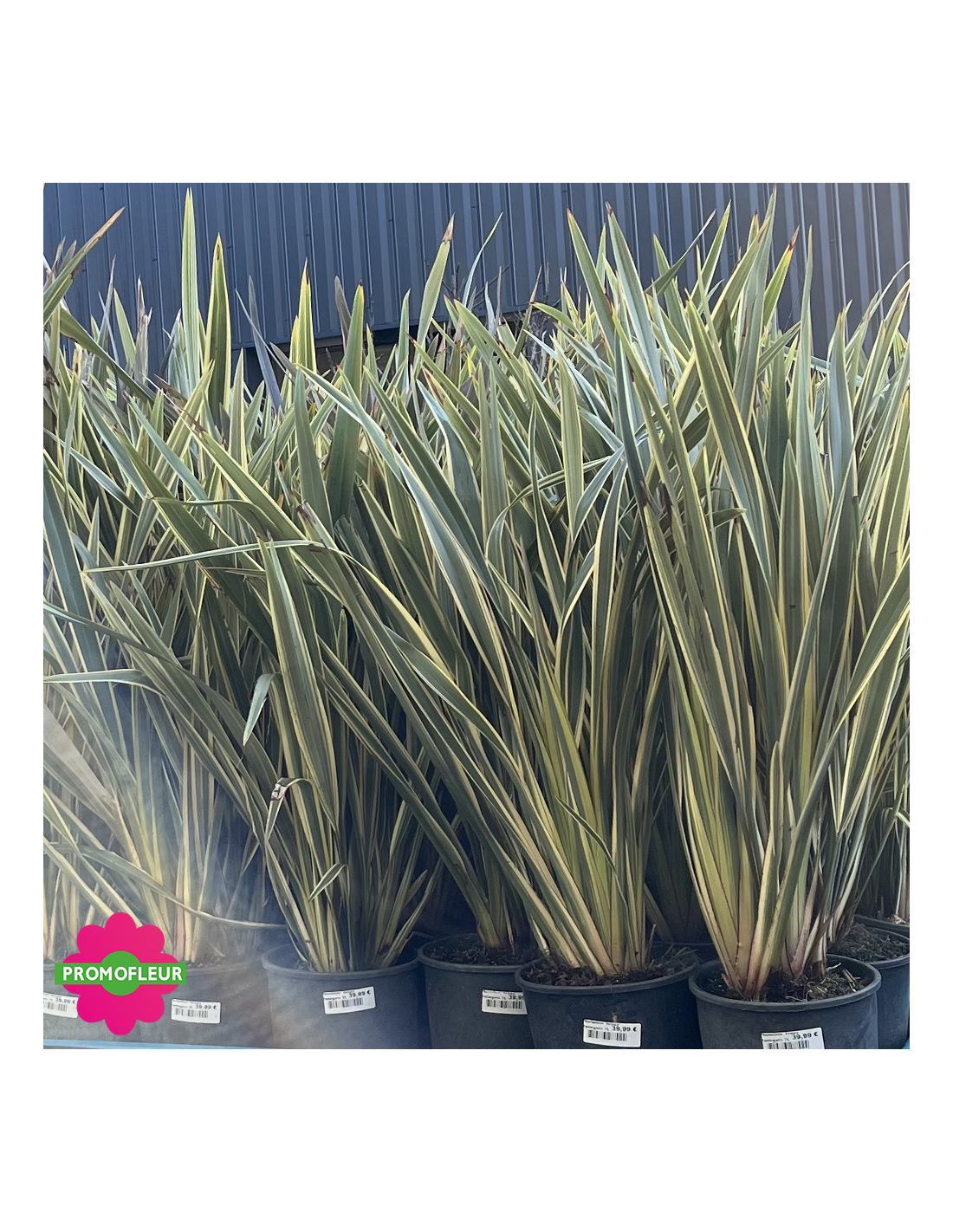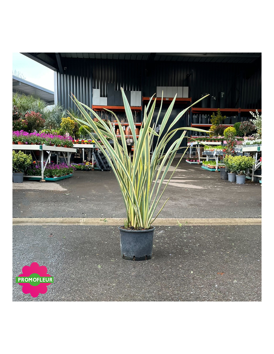 Ce Phormium tenax Variegata (Lin de Nouvelle Zélande) mesure environ 100 cm avec le pot. Le feuillage persistant de cette plante lui permet d'être une belle plante de décoration. Il est composé de longues feuilles vertes foncées et dorées sur ces bords. Le Phormium tenax Variegata a beaucoup de succès pour les amateurs d'ambiance et de décor exotique !