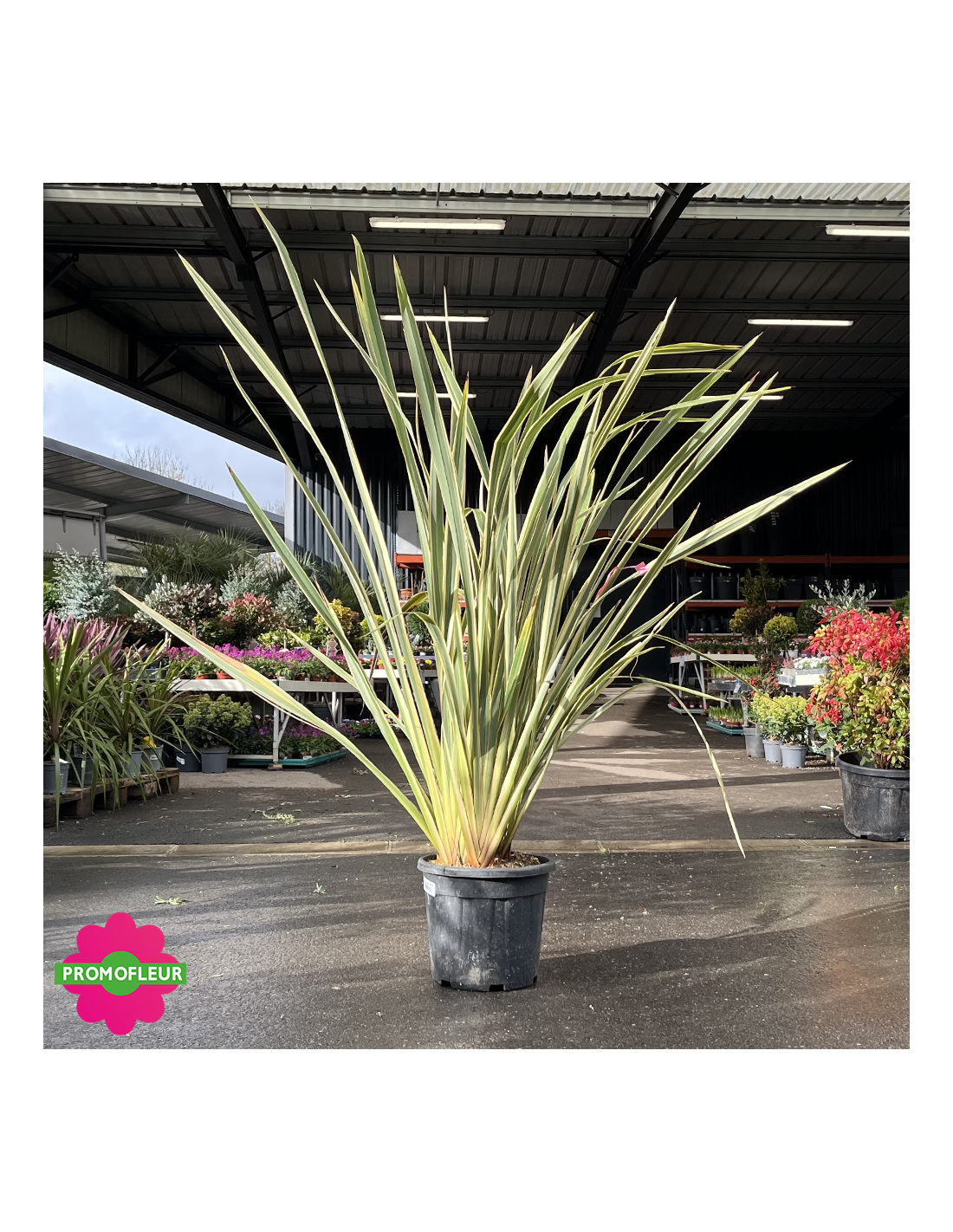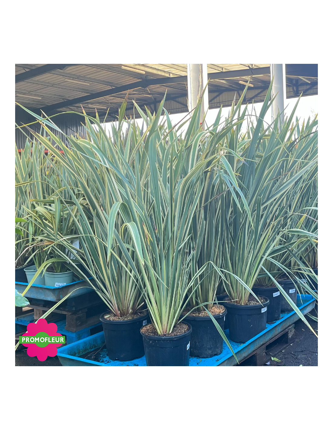Ce Phormium tenax Variegata (Lin de Nouvelle Zélande) mesure environ 100 cm avec le pot. Le feuillage persistant de cette plante lui permet d'être une belle plante de décoration. Il est composé de longues feuilles vertes foncées et dorées sur ces bords. Le Phormium tenax Variegata a beaucoup de succès pour les amateurs d'ambiance et de décor exotique !