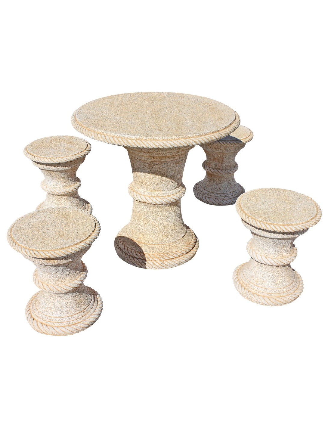 Ce salon de jardin MANGO Ocre est composé d'une table ronde de diamètre 80 cm et de hauteur 74 cm et de 4 tabourets ronds de diamètre 40 cm et de hauteur 45 cm. D'un poids total de 265 kg, le salon de jardin en pierre MANGO ne s'envolera pas au premier coup de vent ! La structure métallique à l'intérieur des éléments et le procédé de fabrication du fabricant espagnol Framusa lui assure une résistance dans le temps et aux variations climatiques (pluie, gel et aux UV) !