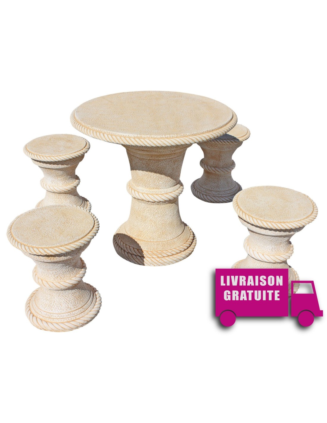 Le salon de jardin MANGO est en pierre reconstituée. La couleur Ocre donnera un aspect classique et traditionnel à la terrasse ou jardin dans lequel il se trouvera.