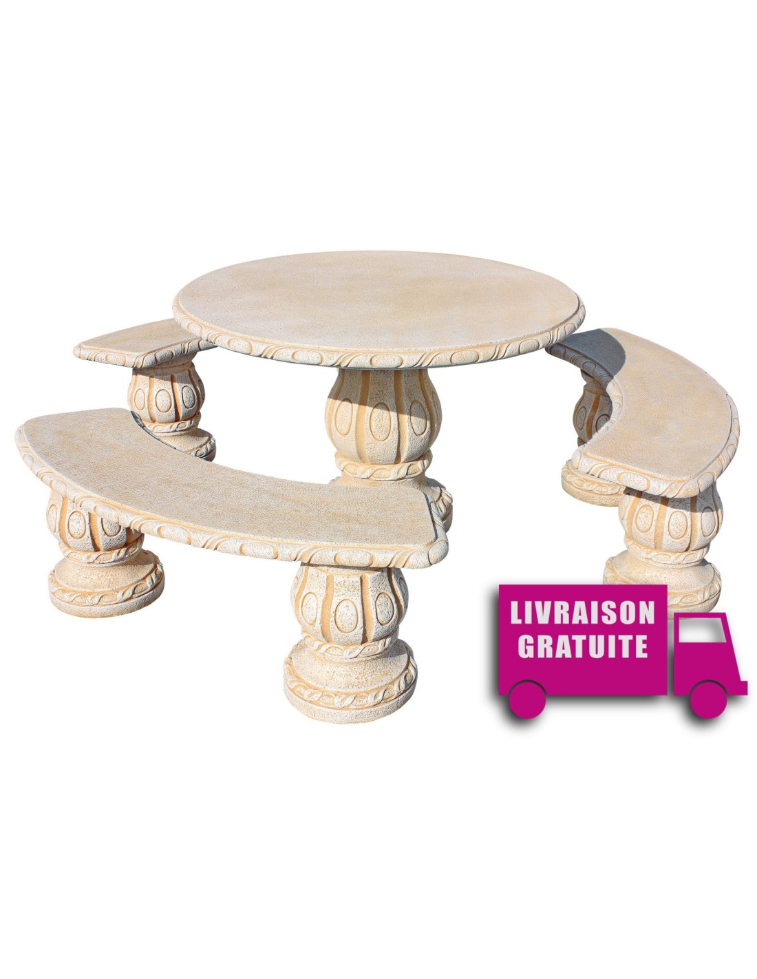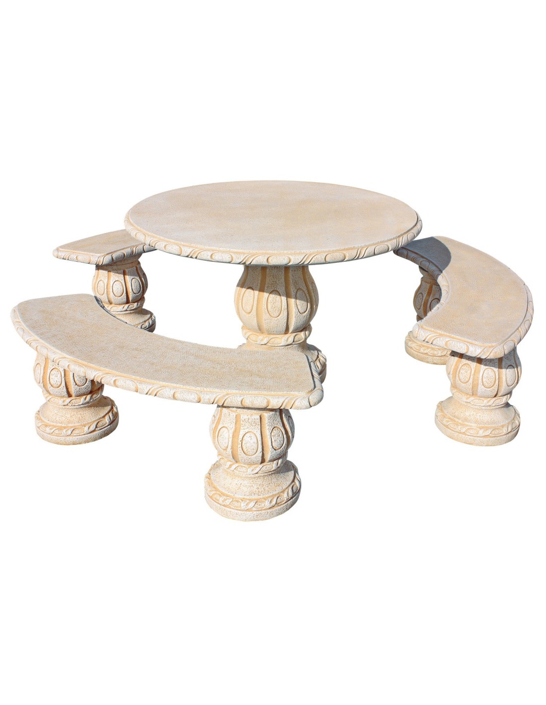 Ce salon de jardin ALAMO Ocre est composé d'une table ronde de diamètre 120 cm et de hauteur 74 cm et de 3 bancs arrondis de longueur 140 cm, de largeur 35 cm et de hauteur 46 cm. D'un poids total de 514 kg, le salon de jardin en pierre ALAMO ne s'envolera pas au premier coup de vent ! La structure métallique à l'intérieur des éléments et le procédé de fabrication du fabricant espagnol Framusa lui assure une résistance dans le temps et aux variations climatiques (pluie, gel et aux UV) !