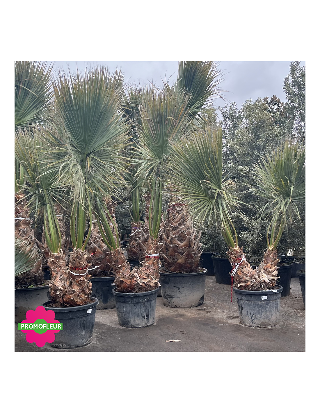 Ce Palmier Washingtonia Filifera double troncs (de la famille des arécacées) de 250 cm de hauteur environ provient d’Espagne.